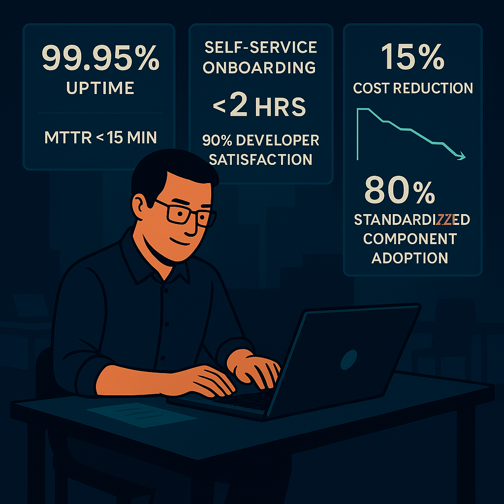 • Self-service onboarding <2 hrs, 90% developer satisfaction.